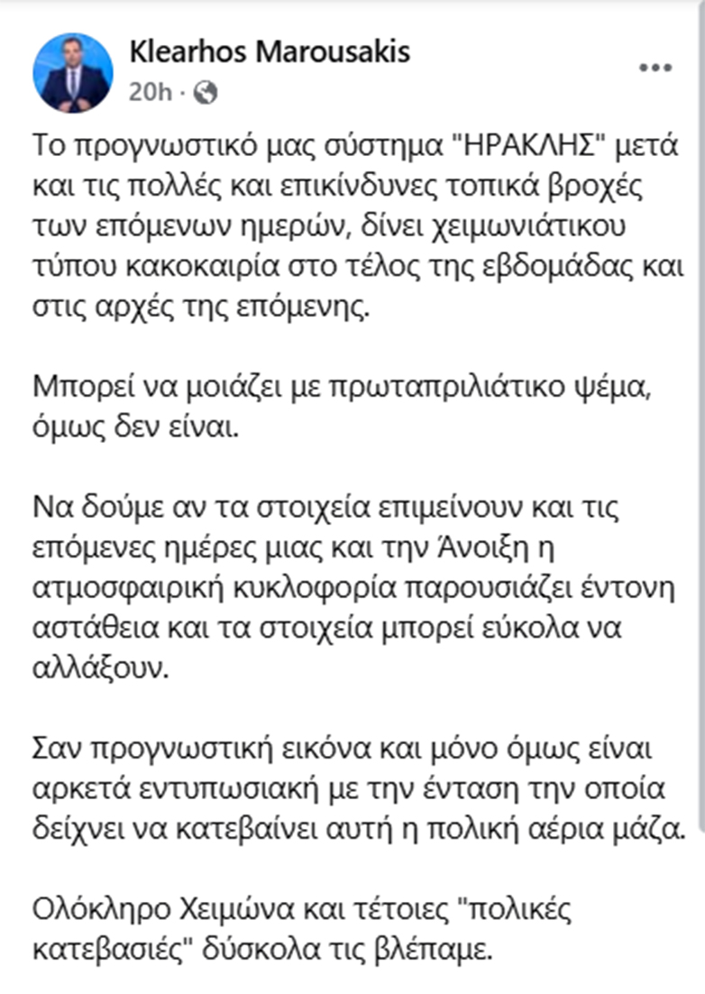 Ειδικότερα, σε ανάρτησή του γράφει: «Το προγνωστικό μας σύστημα “ΗΡΑΚΛΗΣ” μετά και τις πολλές και επικίνδυνες τοπικά βροχές των επόμενων ημερών, δίνει χειμωνιάτικου τύπου κακοκαιρία στο τέλος της εβδομάδας και στις αρχές της επόμενης.