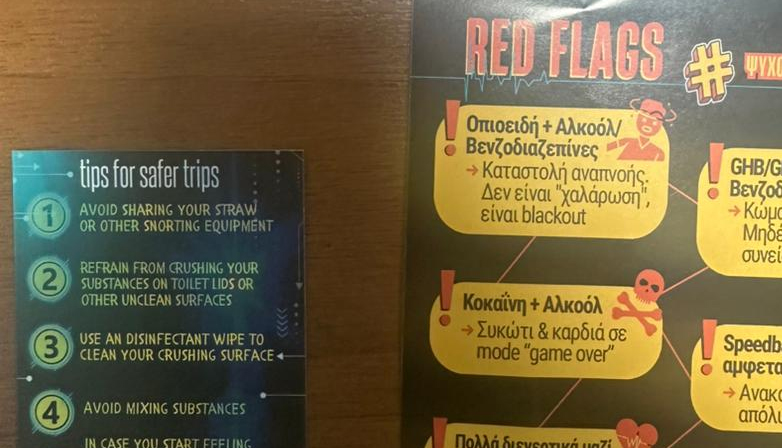 Τέλος, βρέθηκε μέχρι και φυλλάδιο με οδηγίες για την «ασφαλή χρήση» ναρκωτικών με χαρακτηριστική η φράση στο κάτω μέρος «Άσε το μιξάρισμα στον dj».
