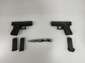 Από την έρευνα που πραγματοποιήθηκε οι αστυνομικοί βρήκαν στην κατοχή του 43χρονου -2- πιστόλια, με γεμιστήρες που έφεραν -13- και -17- φυσίγγια αντίστοιχα, καθώς και γεμιστήρα με -14- φυσίγγια. Επιπλέον, στο εσωτερικό του οχήματος βρέθηκε σε σημείο άμεσα προσβάσιμο από τον 45χρονο αναδιπλούμενος σουγιάς, συνολικού μήκους -21,5- εκατοστών, καθώς και το χρηματικό ποσό των -3.435- ευρώ.