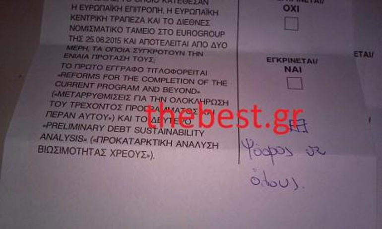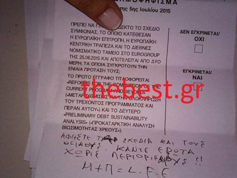 Όπως στις εθνικές εκλογές, έτσι και στο δημοψήφισμα της Κυριακής ορισμένοι επέλεξαν να εκφράσουν τις σκέψεις τους πάνω στα ψηφοδέλτια. «Αφήστε τα σχέδια και τους θεσμούς, κάντε έρωτα χωρίς περιορισμούς», ήταν ένα από τα μηνύματα που αντίκρισαν τα μέλη εφορευτικής επιτροπής στην Πάτρα.