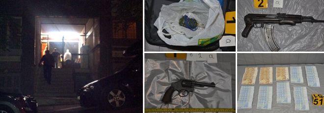 Σε δύο σπίτια του 30χρονου συλληφθέντος σε Αθήνα και Θεσσαλονίκη εντοπίστηκαν: πλήρης αμυντική χειροβομβίδα, ένα καλάσνικοφ, ένα περίστροφο διαμετρήματος 38 mm , 5.000 ευρώ, ένα αεροβόλο πιστόλι και ένα αεροβόλο τυφέκιο.