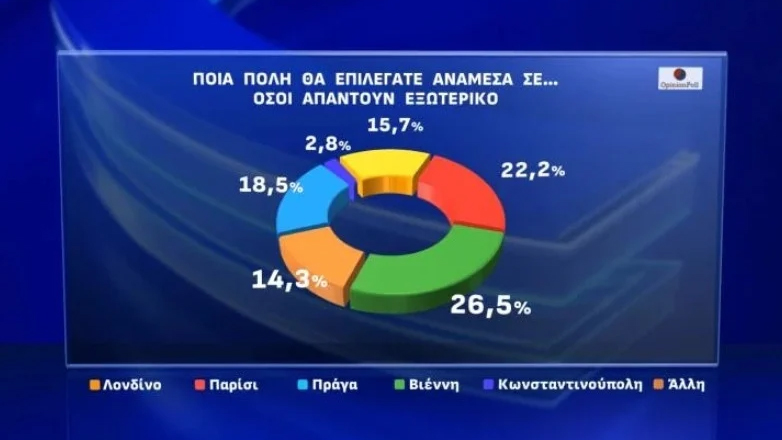 Στο ερώτημα για τον ιδανικό προορισμό εκτός Ελλάδας για τις ημέρες των εορτών, η Βιέννη να βγαίνει πρώτη με 26,5%, ενώ ακολουθεί το Παρίσι με 22,2%.