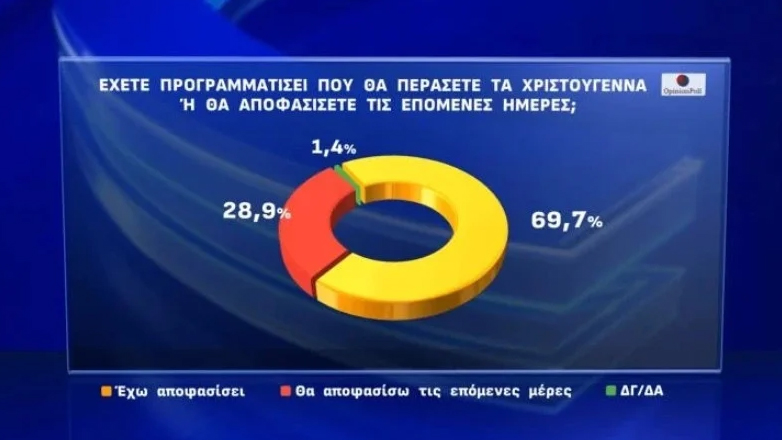 Σύμφωνα με τη δημοσκόπηση οι περισσότεροι έχουν ήδη αποφασίσει το πού θα κάνουν Χριστούγεννα, με το 69,7% να απαντά καταφατικά στο εν λόγω ερώτημα, ενώ το 28,9% θα αποφασίσει τις επόμενες ημέρες.