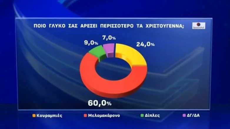 Συντριπτική επικράτηση των μελομακάρονων έναντι των κουραμπιέδων καταγράφει νέα δημοσκόπηση της Opinion Poll για το Action24, η οποία καταγράφει επίσης και τις προτιμήσεις των πολιτών για το πώς και πού θα γιορτάσουν τα Χριστούγεννα και την Πρωτοχρονιά.