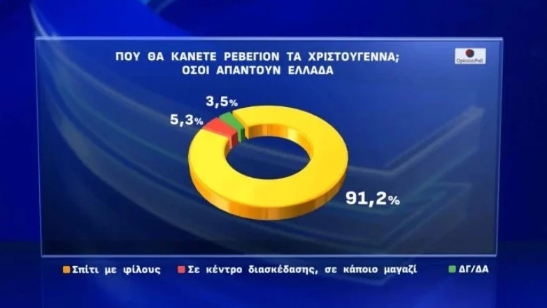 Συντριπτικά υπερέχουν τα σπιτικά Χριστούγεννα, αφού στην ερώτηση για το ρεβεγιόν των Χριστουγέννων, με το 91,2% να απαντά ότι θα είναι «σπίτι με φίλους», ενώ μόλις το 5,3% λέει ότι θα βγει σε κάποιο μαγαζί.