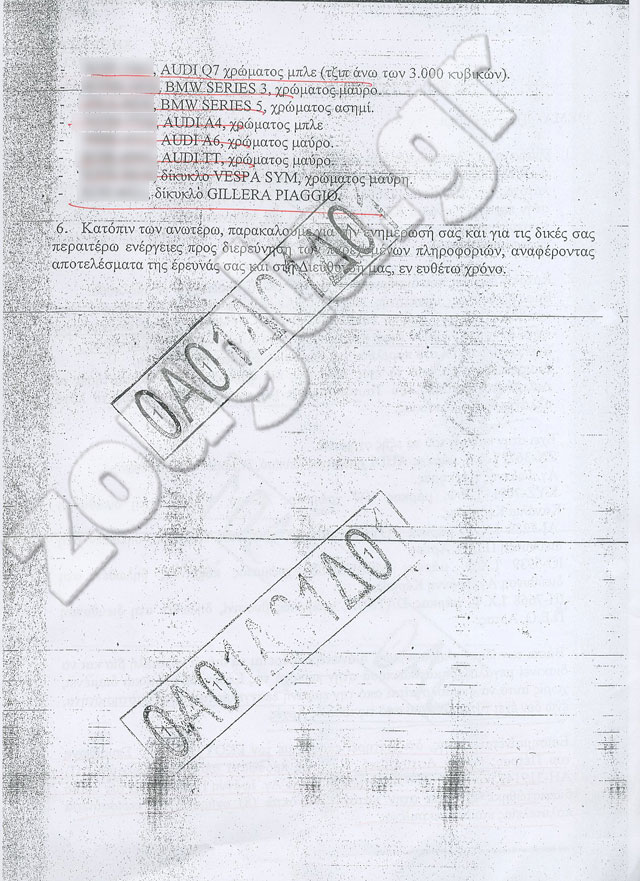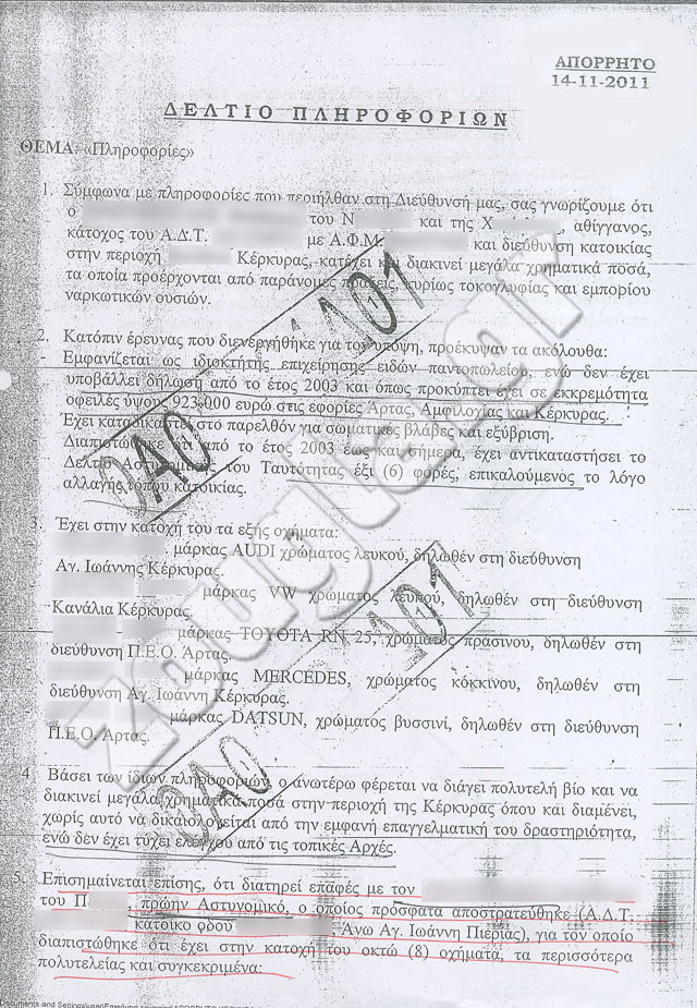 Δηλαδή οι αξιωματικοί του αρχηγείου γνώριζαν από τον Νοέμβριο του 2011, κάτι που οι ομόλογοί τους στο επτανήσιο νησί αγνοούσαν (;), παρ’ όλο που οι αναφορές στην εγκληματική ομάδα από τον τοπικό τύπο ήταν σχεδόν καθημερινές. Συγκεκριμένα, το έγγραφο απεστάλη στην Κέρκυρα στις 14 Νοεμβρίου 2011, έχει ως θέμα «Πληροφορίες», ενώ φέρει την επισήμανση «ΑΠΟΡΡΗΤΟ».