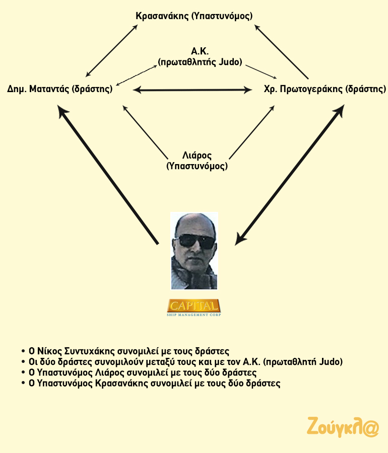 Παράλληλα, ο Α.Κ. επικοινωνεί με τους αστυνομικούς Λιάρο και Κρασανάκη, του οποίου το όνομα δεν αναφέρεται μεν, αλλά ο αριθμός του κινητού τηλεφώνου που λήγει σε… 020 ανήκει σε αυτόν. Οι πρωταγωνιστές της δολοφονικής ενέργειας, με τον έναν ή τον άλλον τρόπο, επικοινωνούν τελικά με τον Νίκο Συντυχάκη, σε τηλέφωνο που εντοπίζεται εντός της εταιρείας Capital του Βαγγέλη Μαρινάκη επί της οδού Ιάσωνος 3 στον Πειραιά.
