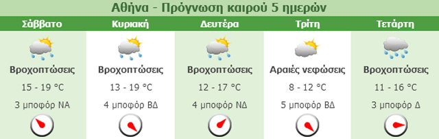 Θα σημειωθούν νεφώσεις παροδικά αυξημένες με σποραδικές βροχές κυρίως στα νότια και από το βράδυ καταιγίδες. Τη νύχτα τα φαινόμενα κατά τόπους θα είναι έντονα στη νοτιά Πελοπόννησο και πιθανώς στην Αττική και τη νότια Εύβοια. Οι άνεμοι θα πνέουν νοτιοδυτικοί 4 με 6 πρόσκαιρα στα ανατολικά και νότια τοπικά 7 μποφόρ. Η θερμοκρασία θα κυμανθεί από 7 ως 20 βαθμούς Κελσίου.