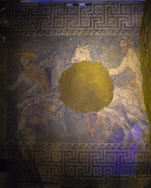 Η παράσταση διακρίνεται για την εξαίρετη τέχνη στην απόδοση των λεπτομερειών τόσο των μορφών όσο και των αλόγων, όπως και για την αρμονία των χρωμάτων. Η σύνθεση είναι σύγχρονη του ταφικού συγκροτήματος και χρονολογείται στο τελευταίο τέταρτο του 4ου αιώνα π.Χ. Το ψηφιδωτό έχει υποστεί φθορά στο κέντρο, σε σχήμα κύκλου με διάμετρο 0,80 μ. Ωστόσο, πολλά μέρη από το φθαρμένο τμήμα έχουν βρεθεί στην αμμώδη επίχωση. Τις επόμενες μέρες θα γίνει προσπάθεια συγκόλλησης και αποκατάστασής του, προκειμένου να συντεθεί, στο μέτρο του δυνατού, η συνολική εικόνα της παράστασης.
