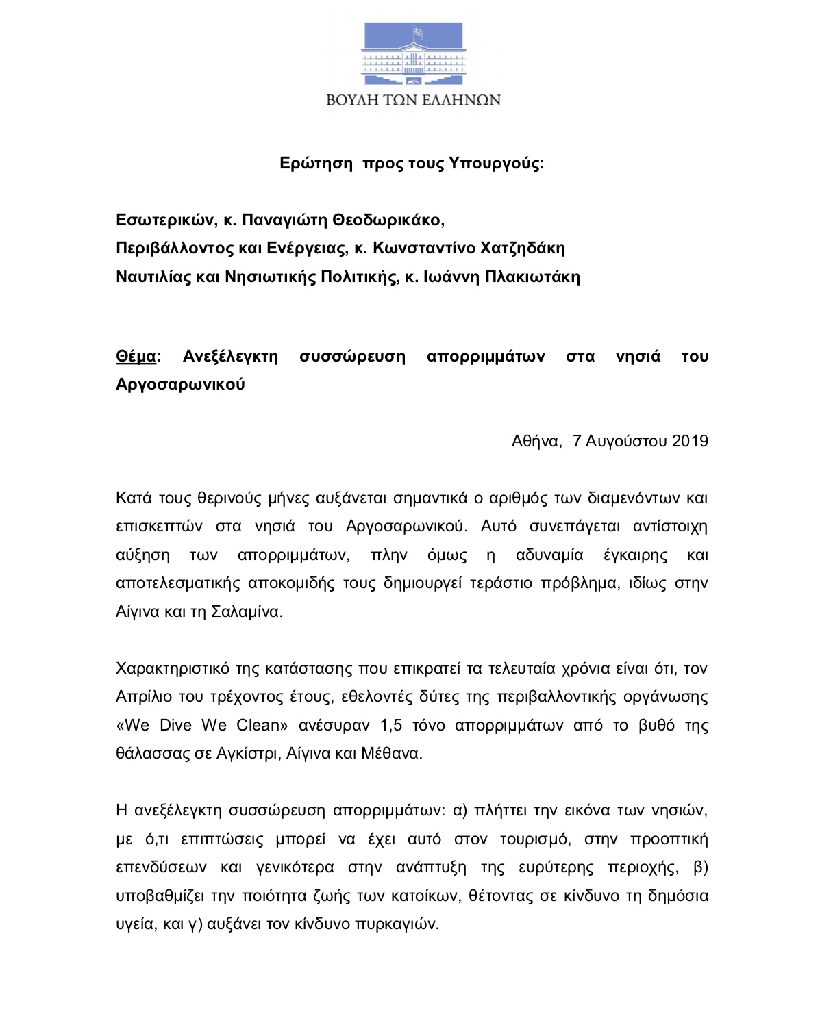 Για  τους  λόγους  αυτούς  σας  εκφράζω  την  βαθύτατη  ανησυχία  μου  για  την κατάσταση  και  τους  τεράστιους  κινδύνους  που  εγκυμονεί  αυτή  για  την  Σαλαμίνα  και  τους κατοίκους  της  και  σας  καλώ  όπως  πράξετε  τα  δέοντα.