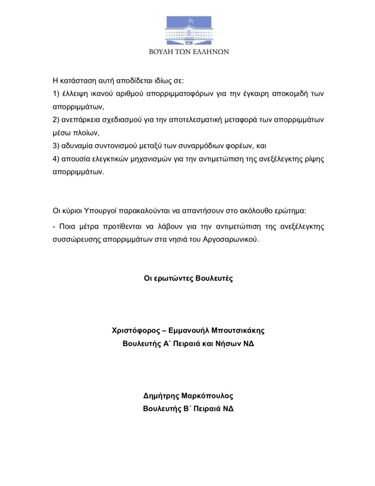 Το θέμα έφτασε πρόσφατα και στη βουλή, με τους δύο βουλευτές Χριστόφορο Μπουτσικάκη και Δημήτρη Μαρκόπουλο, από τη Νέα Δημοκρατία, να καταθέτουν από κοινού σχετική ερώτηση.