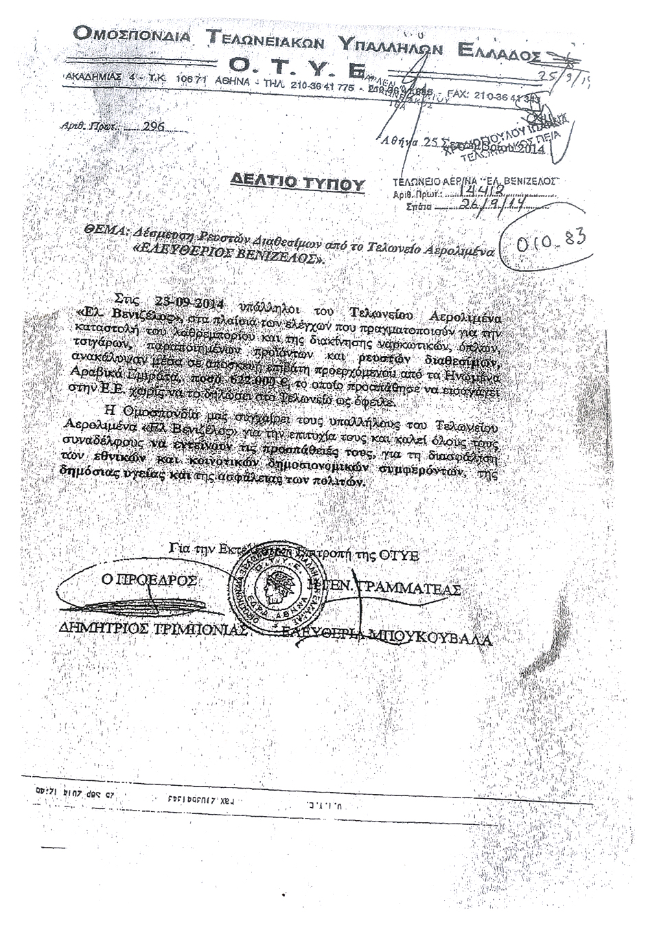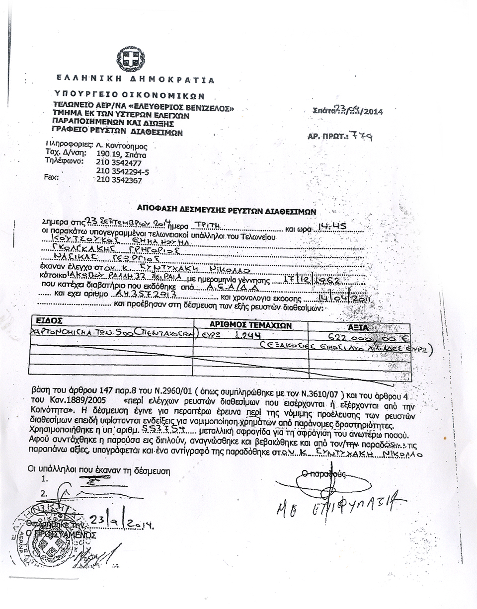 Ο κ. Συντυχάκης σύμφωνα με τα επίσημα έγγραφα της τελωνειακής αρχής του Αεροδρομίου «Ελευθέριος Βενιζέλος» συνελήφθη στις 23/09/2014 με 622.000 ευρώ σε χαρτονομίσματα των 500, που τα είχε τοποθετημένα σε μία βαλίτσα γραφείου, ποσό αδήλωτο και χωρίς κάποιο παραστατικό. Οι αρχές δέσμευσαν το ποσό, κατέγραψαν ως όφειλαν την παράνομη διακίνηση και προχώρησαν στις καθορισμένες από τον νόμο διαδικασίες.
