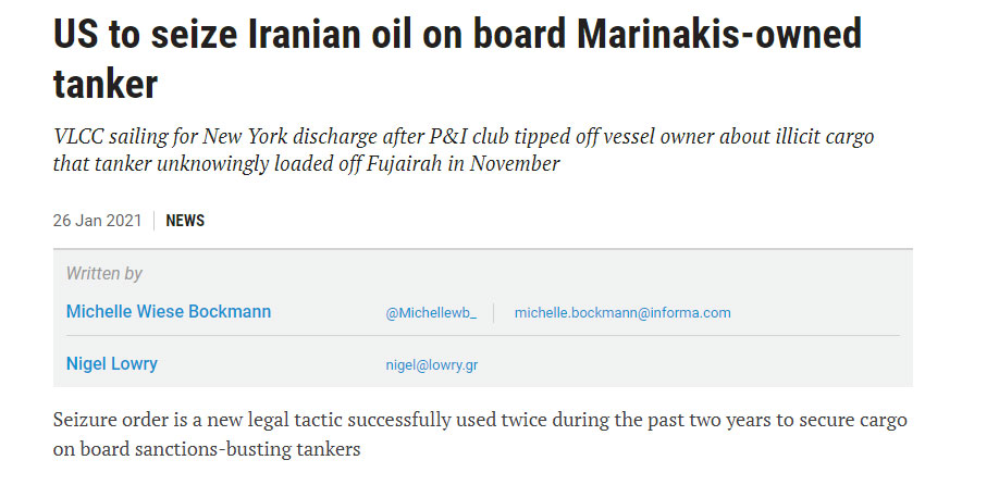 Ήδη από την Τρίτη 26 Ιανουαρίου το πρακτορείο ειδήσεων Bloomberg μετέδωσε την είδηση αυτή, η οποία συνοδεύεται από εκτενές ρεπορτάζ. Το νεότερο δημοσίευμα αναφέρεται απευθείας στον πλοιοκτήτη, και μάλιστα στον τίτλο του άρθρου, όπου εξηγείται όλη η διαδικασία που έχει υιοθετηθεί από τις αμερικανικές αρχές προκειμένου να εντοπίζεται και να δεσμεύεται οποιοδήποτε φορτίο υδρογονανθράκων προέρχεται από το Ιράν στο πλαίσιο του εμπάργκο που έχουν επιβάλει οι ΗΠΑ.