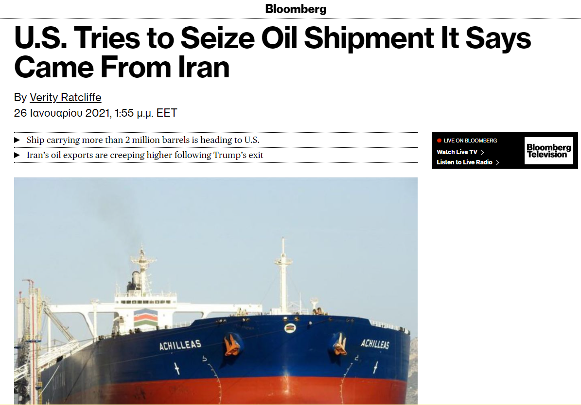 Το πλοίο που μεταφέρει περισσότερα από 2 εκατ. βαρέλια κατευθύνεται στις ΗΠΑ, σύμφωνα με πληροφορίες του πρακτορείου ειδήσεων Bloomberg. Οι εξαγωγές πετρελαίου του Ιράν φαίνεται πως αυξήθηκαν τα τελευταία εικοσιτετράωρα και πάντως μετά την ορκωμοσία του Τζο Μπάιντεν, σχολιάζει το Bloomberg.