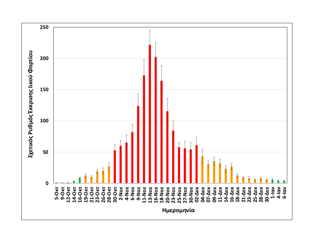 Στο διάγραμμα, που δημοσιεύει το ΑΠΕ-ΜΠΕ, οι ημέρες των δειγματοληψιών που καταγράφονται με κόκκινο χρώμα αντιστοιχούν σε περισσότερα από 500 κρούσματα -όπως ανακοινώθηκαν τις αντίστοιχες ημέρες από τον ΕΟΔΥ,- οι μέρες που καταγράφονται με πορτοκαλί σε 100-400 κρούσματα και οι μέρες που καταγράφονται με πράσινο σε λιγότερα από εκατό κρούσματα.