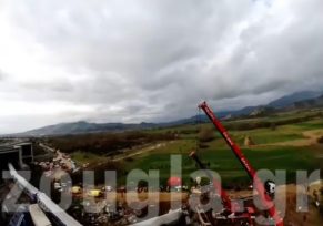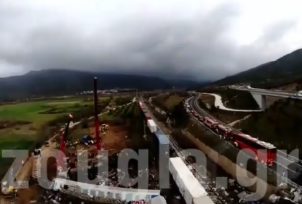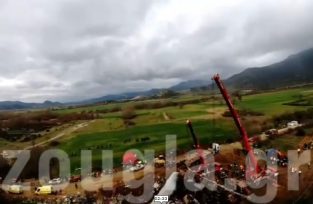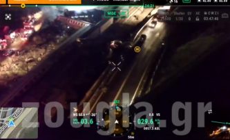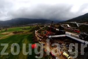 Στο βίντεο μπορεί πάλι κανείς να δει τη θέση των βαγονιών, τα σωστικά συνεργεία αλλά και τους δύο μεγάλους γερανούς που έχουν τοποθετηθεί στο σημείο, προκειμένου να απελευθερώσουν τη σιδηροδρομική γραμμή.
