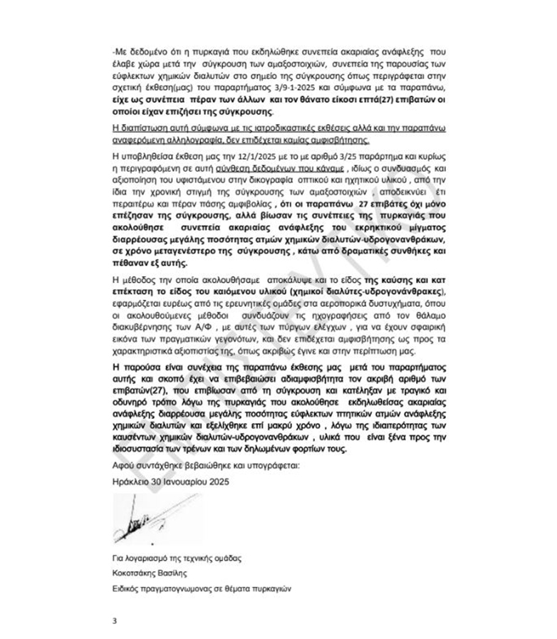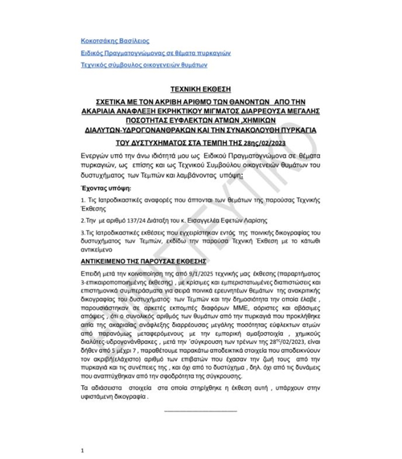 Όπως αναφέρει η έκθεση: «Επειδή μετά την κοινοποίηση της από 9/1/2025 τεχνικής μας έκθεσης (παραρτήματος 3-επικαιροποποιημένης έκθεσης), με κρίσιμες και εμπεριστατωμένες διαπιστώσεις και επιστημονικά συμπεράσματα για σειρά ποινικά ερευνητέων θεμάτων της ανακριτικής δικογραφίας του δυστυχήματος των Τεμπών και την δημοσιότητα την οποία έλαβε, παρουσιάστηκαν σε αρκετές εκπομπές διαφόρων ΜΜΕ, αόριστες και αβάσιμες απόψεις , ότι ο συνολικός αριθμός των θυμάτων από την πυρκαγιά που προκλήθηκε αιτία της ακαριαίας ανάφλεξης διαρρέουσας μεγάλης ποσότητας εύφλεκτων ατμών από παρανόμως μεταφερόμενους με την εμπορική αμαξοστοιχία, χημικούς διαλύτες-υδρογονάνθρακες , μετά την σύγκρουση των τρένων της 28ης/02/2023, είναι δήθεν από 5 μέχρι 7 , παραθέτουμε παρακάτω αποδεικτικά στοιχεία που αποδεικνύουν τον ακριβή(ελάχιστο) αριθμό των επιβατών που έχασαν την ζωή τους από την πυρκαγιά και τις συνέπειες της , και όχι από το δυστύχημα , δηλ. όχι από τις δυνάμεις που αναπτύχθηκαν από την σφοδρότητα της σύγκρουσης», αναφέρει η επίμαχη έκθεση.