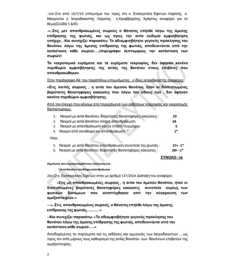 Στην έκθεση αναφέρεται ότι ουσιαστικά ο Εισαγγελέας Εφετών αποδέχεται τα πορίσματα και τις εκθέσεις και ερμηνείες των Ιατροδικαστών ως προς τον από μέρους τους καθορισμό της αιτίας θανάτου των θανόντων επιβατών της αμαξοστοιχίας.
