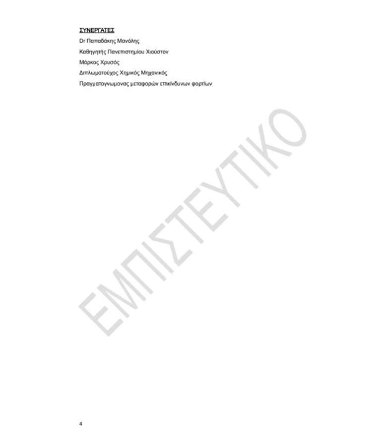 Την έκθεση υπογράφουν εκτός του κ. Κοκοτσάκη, ο οποίος είναι ειδικός πραγματογνώμονας σε θέματα πυρκαγιών, ο Dr Μανόλης Παπαδάκης, Καθηγητής Πανεπιστημίου Χιούστον και ο Μάρκος Χρυσός, Διπλωματούχος Χημικός Μηχανικός Πραγματογνωμονας μεταφορών επικίνδυνων φορτίων.