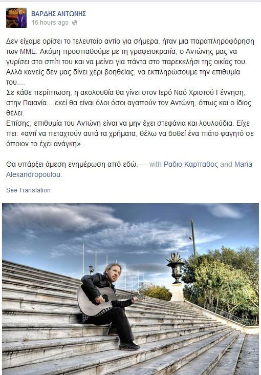 Δείτε την ανακοίνωση που αναρτήθηκε στην επίσημη ιστοσελίδα του Αντώνη Βαρδή στο Facebook
