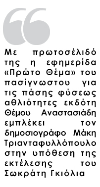 Με πρωτοσέλιδό της η εφημερίδα «Πρώτο Θέμα» του πασίγνωστου για τις πάσης φύσεως αθλιότητες εκδότη Θέμου Αναστασιάδη εμπλέκει τον δημοσιογράφο Μάκη Τριανταφυλλόπουλο στην υπόθεση της εκτέλεσης του Σωκράτη Γκιόλια από την οργάνωση «Σέχτα Επαναστατών».