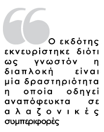 Είναι προφανές ότι ο εκδότης εκνευρίστηκε, διότι ως γνωστόν η διαπλοκή είναι μια δραστηριότητα η οποία οδηγεί αναπόφευκτα σε αλαζονικές συμπεριφορές. Συνηθίζει, βλέπετε, ο κάθε διαπλεκόμενος στη δουλικότητα των παρακατιανών.