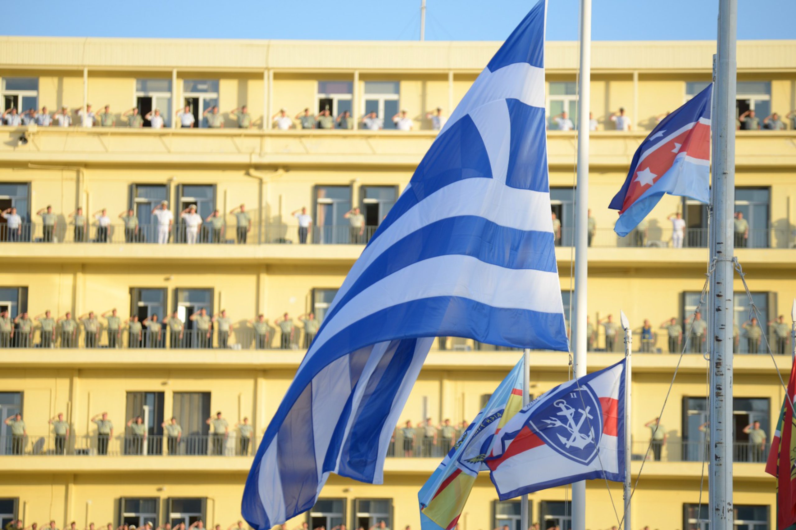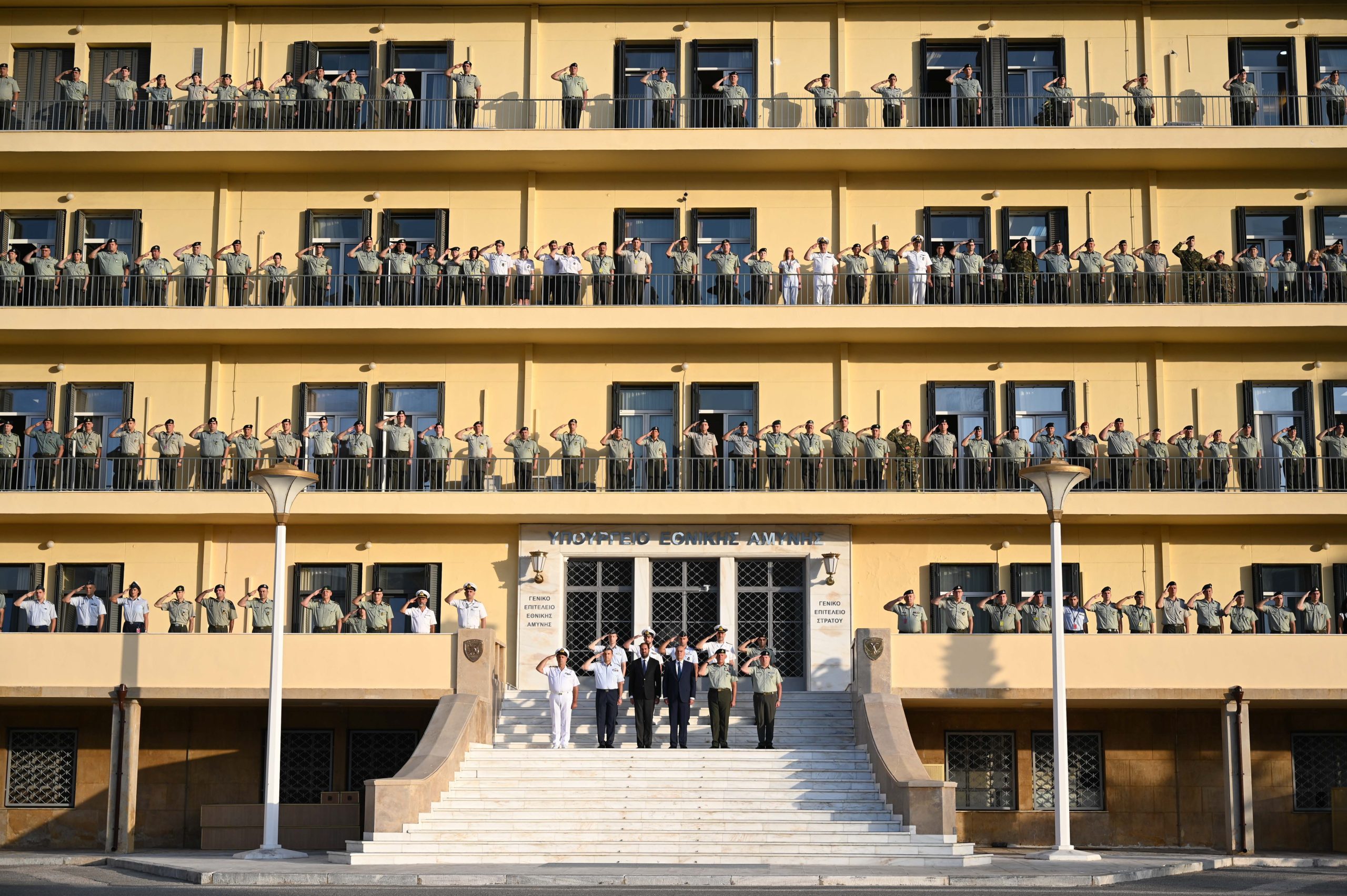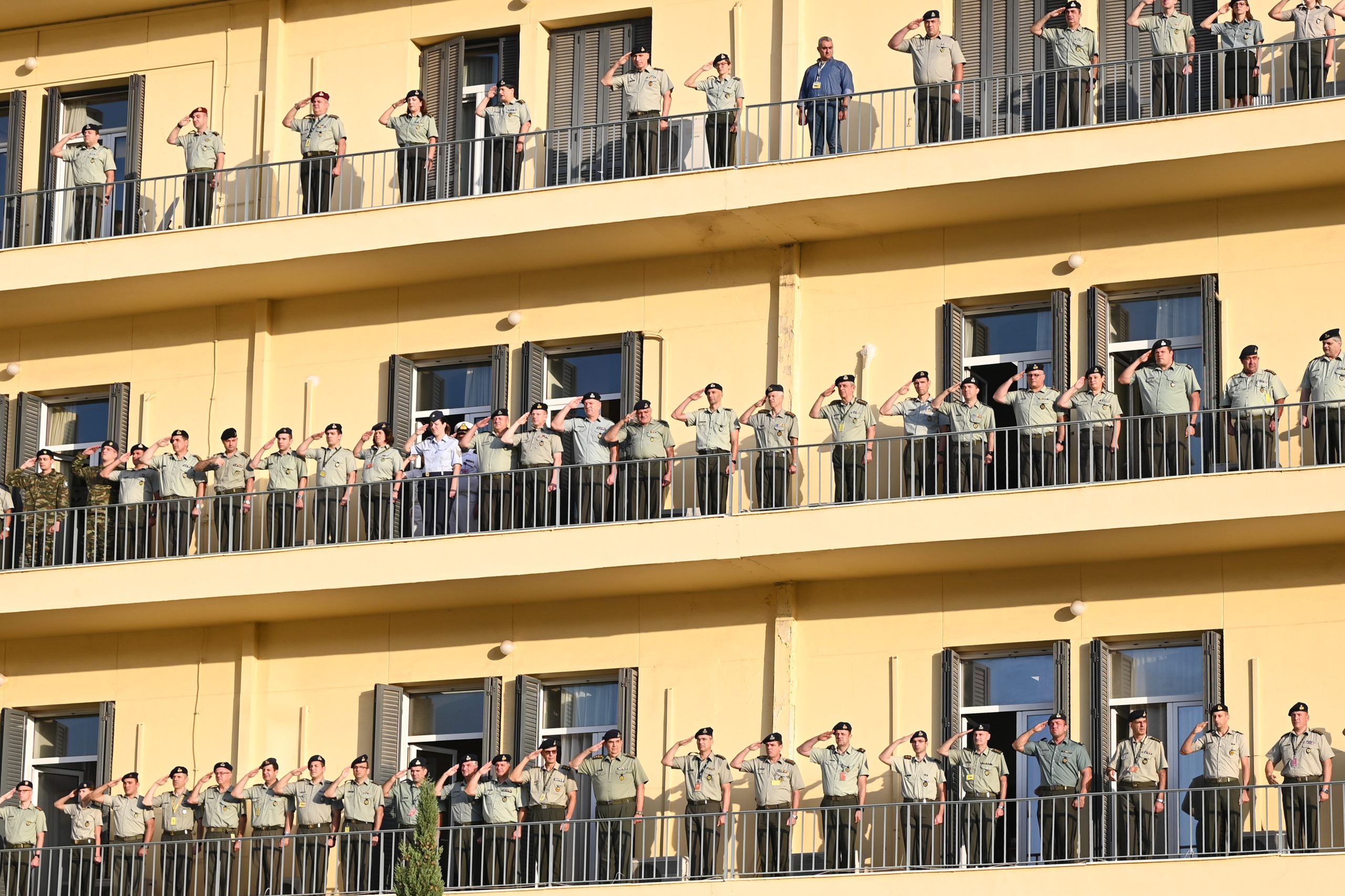 Οι εικόνες από το υπουργείο Εθνικής Άμυνας είναι συγκινητικές με την πολιτική και στρατιωτική ηγεσία να στέκεται ακίνητη και σιωπηλή όπως και τα στελέχη των Ενόπλων Δυνάμεων κατά την έπαρση της σημαίας.