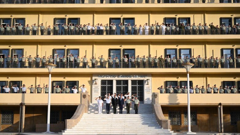 Οι εικόνες από το υπουργείο Εθνικής Άμυνας είναι συγκινητικές με την πολιτική και στρατιωτική ηγεσία να στέκεται ακίνητη και σιωπηλή όπως και τα στελέχη των Ενόπλων Δυνάμεων κατά την έπαρση της σημαίας.