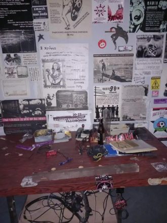 Βρέθηκαν και κατασχέθηκαν 6 μονάδες υπολογιστών, σπρέι, πλήθος αφισών αναρχικού περιεχομένου, σακίδιο με στολή αεροπορίας, πανό, γάντια, χειρόγραφες σημειώσεις, τηλεβόας και μόντεμ.