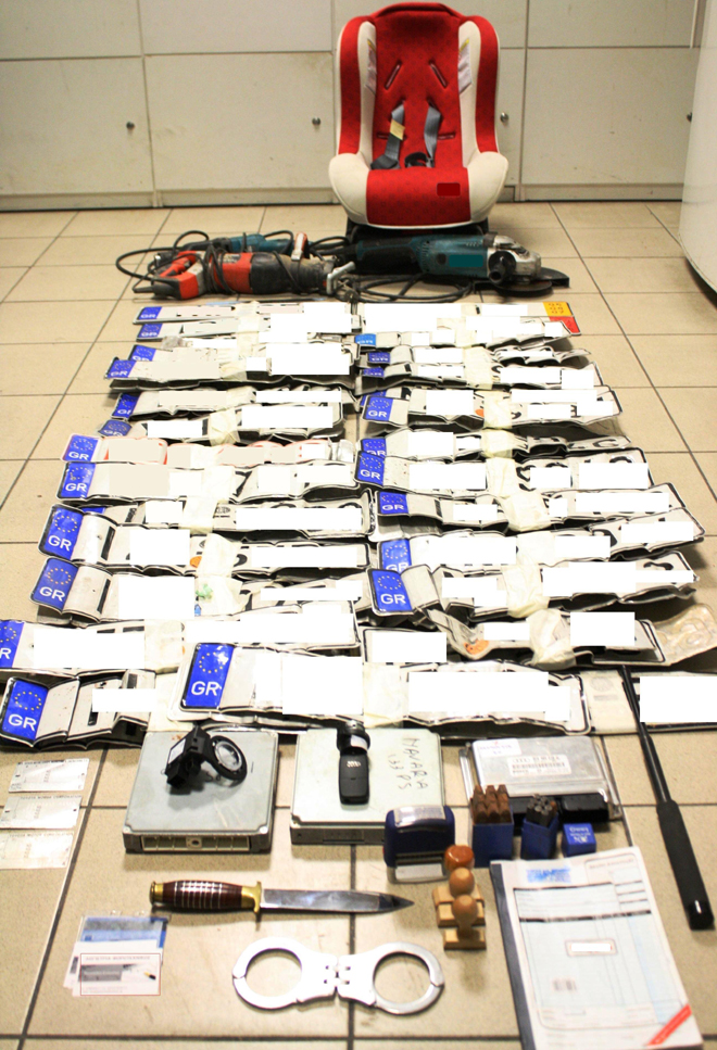 Σε έρευνες που ακολούθησαν σε χώρους της μάντρας καθώς και σε σταθμευμένο φορτηγό αυτοκίνητο, ιδιοκτησίας του 53χρονου, βρέθηκαν και κατασχέθηκαν – μεταξύ άλλων – πληθώρα πινακίδων κυκλοφορίας και τμημάτων αυτοκινήτων, ένα κυνηγετικό μαχαίρι, ένα ζεύγος χειροπέδες, ένα μεταλλικό πτυσσόμενο κλομπ, τρεις ξύλινες σφραγίδες με στοιχεία γιατρών, η γνησιότητα των οποίων εξετάζεται, δύο ηλεκτρικές σπαθοσέγες, ένας ηλεκτρικός τροχός και δύο πλαστικά κυτία που περιείχαν εννέα μεταλλικές πόντες, έκαστη με αριθμούς.
