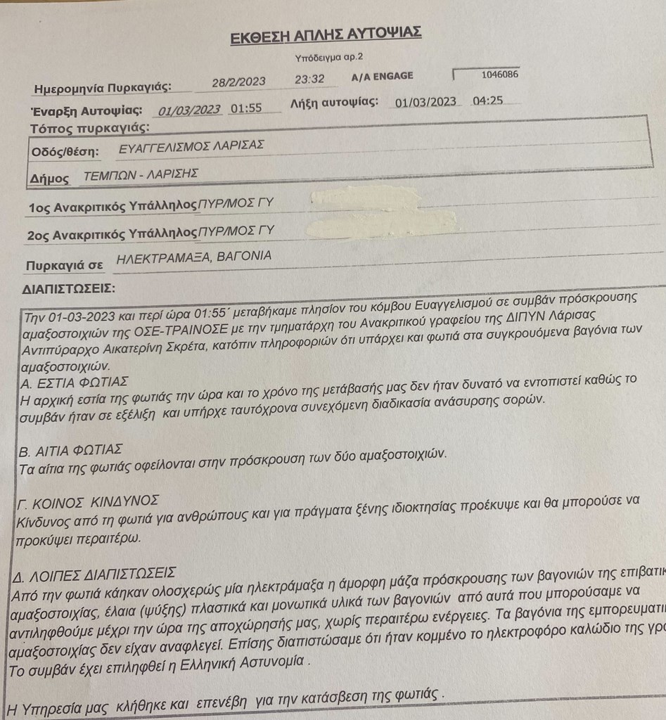 Στην αρχική αυτοψία – έκθεση του ανακριτικού τμήματος του Πυροσβεστικού Σώματος αναφέρεται ότι τα αίτια οφείλονται στην πρόσκρουση των δύο αμαξοστοιχιών, ενώ η αρχική εστία της φωτιάς δεν ήταν δυνατόν να εντοπιστεί, καθώς όπως αναφέρουν το συμβάν ήταν σε εξέλιξη τη στιγμή της δικής τους έρευνας.