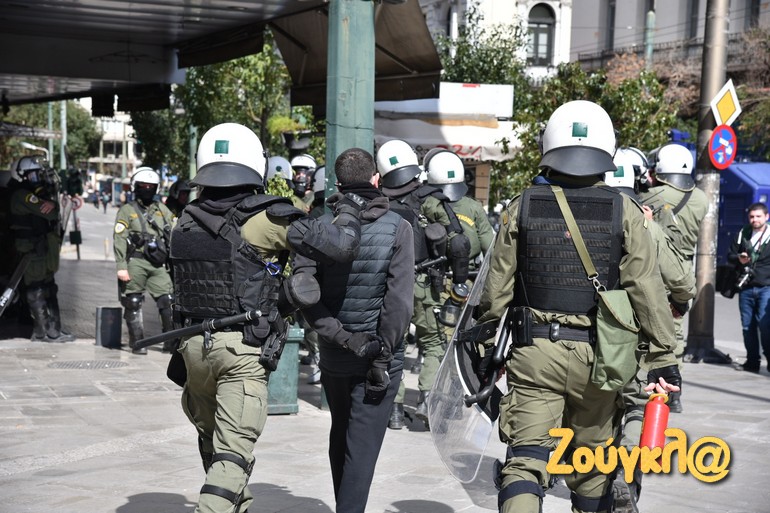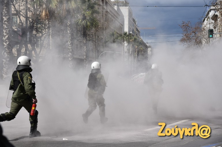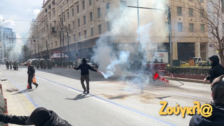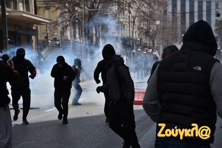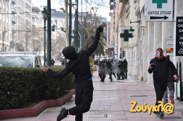 Η ένταση άρχισε στο κάτω μέρος της πλατείας Συντάγματος. Ομάδα αγνώστων, που είχαν καλυμμένα τα χαρακτηριστικά των προσώπων τους, επιτέθηκαν με φωτοβολίδες και πέτρες στην κάτω πλευρά της πλατείας, και οι δυνάμεις των ΜΑΤ απάντησαν με τη ρίψη χημικών και βομβίδων κρότου λάμψης.