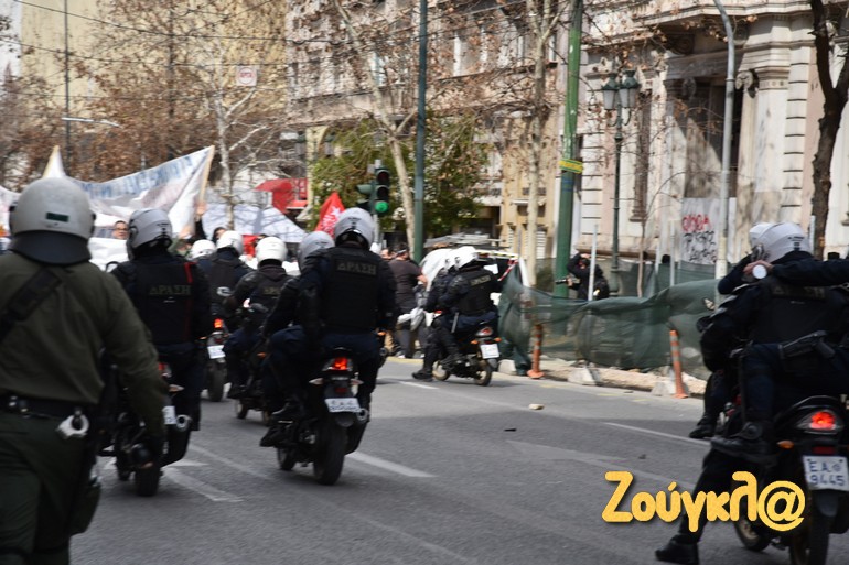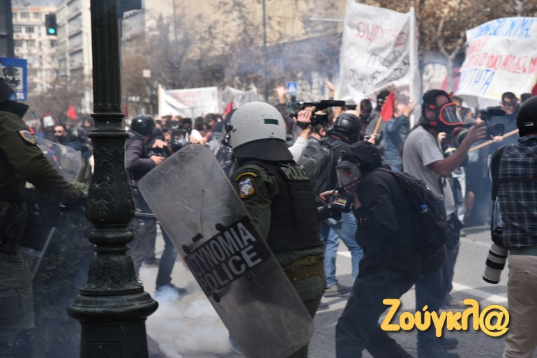 Σύμφωνα με την ΕΛΑΣ, μια ομάδα πάνω από 200 άτομα που βρίσκονταν μέσα και στην περίμετρο της συγκέντρωσης και στη συνέχεια της πορείας, εκτόξευσαν μάρμαρα, πέτρες και βόμβες μολότοφ εναντίον των αστυνομικών δυνάμεων.