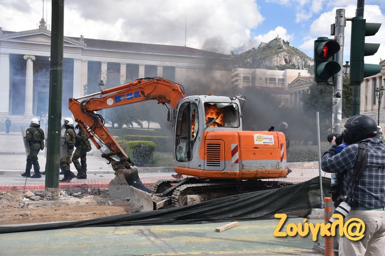 Μάλιστα, πήρε φωτιά μικρή μπουλντόζα του Δήμου Αθηναίων που εκτελεί έργα.
