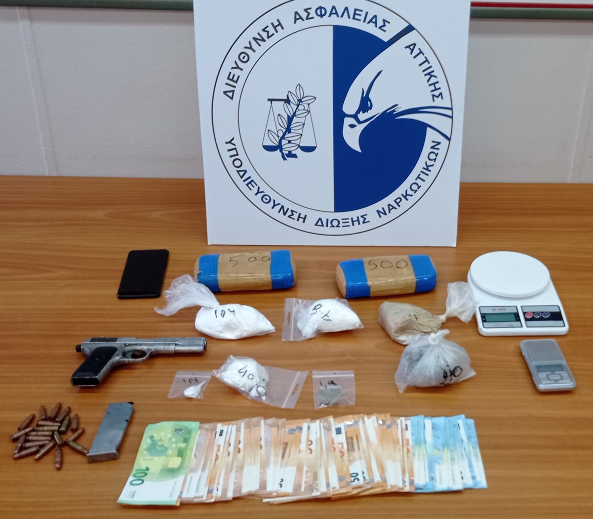 Σύμφωνα με την ΕΛ.ΑΣ., συνολικά, βρέθηκαν και κατασχέθηκαν: 1.132 γραμμάρια ηρωίνης, 223 γραμμ. κοκαΐνης, 1,4 γραμμ. κάνναβης, ένα πιστόλι, 19 φυσίγγια, 2 ηλεκτρονικές ζυγαριές και το χρηματικό ποσό των 3.710 ευρώ.