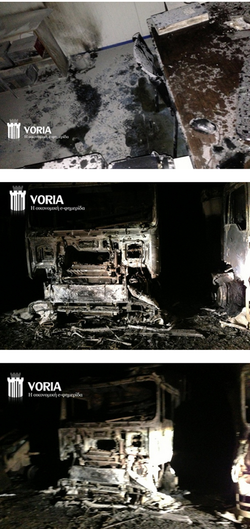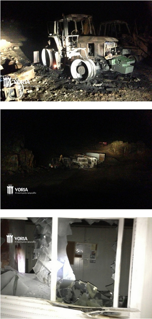 Πηγές της εταιρείας ανέφεραν ότι γύρω στη 01.00 150 περίπου άτομα που φορούσαν κουκούλες εισέβαλαν στο χώρο του εργοταξίου από την πίσω πύλη και, αφού ξυλοκόπησαν, έδεσαν και περιέλουσαν με βενζίνη τους φύλακες της εισόδου, έβαλαν φωτιά στις εγκαταστάσεις καίγοντας τρία φορτηγά, ένα γκρέιντερ, εκσκαφείς, δύο τζιπ, δύο γεννήτριες και τα κοντέινερ όπου στεγάζονται τα γραφεία της εταιρείας. Στη συνέχεια, αποχώρησαν από την κεντρική πύλη.