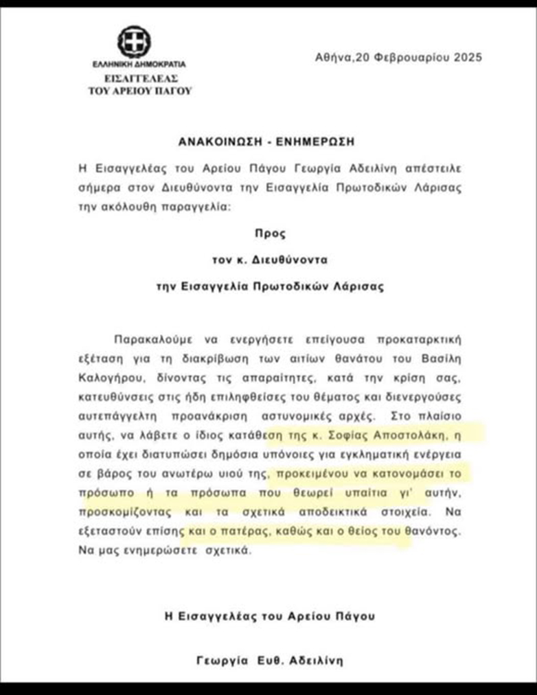 Μετά την παραγγελία της εισαγγελέως του Αρείου Πάγου Γεωργίας Αδειλίνη ώστε να καταθέσουν στις Αρχές άτομα από το οικογενειακό περιβάλλον του Βασίλη Καλογήρου, τα στοιχεία που θα δώσουν τόσο η μητέρα του, εισαγγελέας Λάρισας Σοφία Αποστολάκη, όσο και ο θείος του Γιώργος Αποστολάκης, πρώην βουλευτής της ΝΙΚΗΣ και αρεοπαγίτης, θα ξεκλειδώσουν νέες έρευνες και θεωρείται πιθανόν να αποκλείσουν τα ανεδαφικά σενάρια για τον θάνατό του.