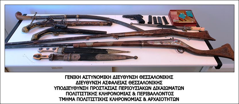 Η κατάλληλη αξιοποίηση πληροφοριών από αστυνομικούς του Τμήματος Πολιτιστικής Κληρονομιάς και Αρχαιοτήτων της Διεύθυνσης Ασφάλειας Θεσσαλονίκης, οδήγησε στη σύλληψη 70χρονης ημεδαπής, σε βάρος της οποίας σχηματίσθηκε δικογραφία για παράβαση της Νομοθεσίας που αφορά σε «Κύρωση κώδικα νομοθεσίας για την Προστασία των Αρχαιοτήτων και εν γένει της πολιτιστικής κληρονομιάς» και της Νομοθεσίας «Περί Όπλων».