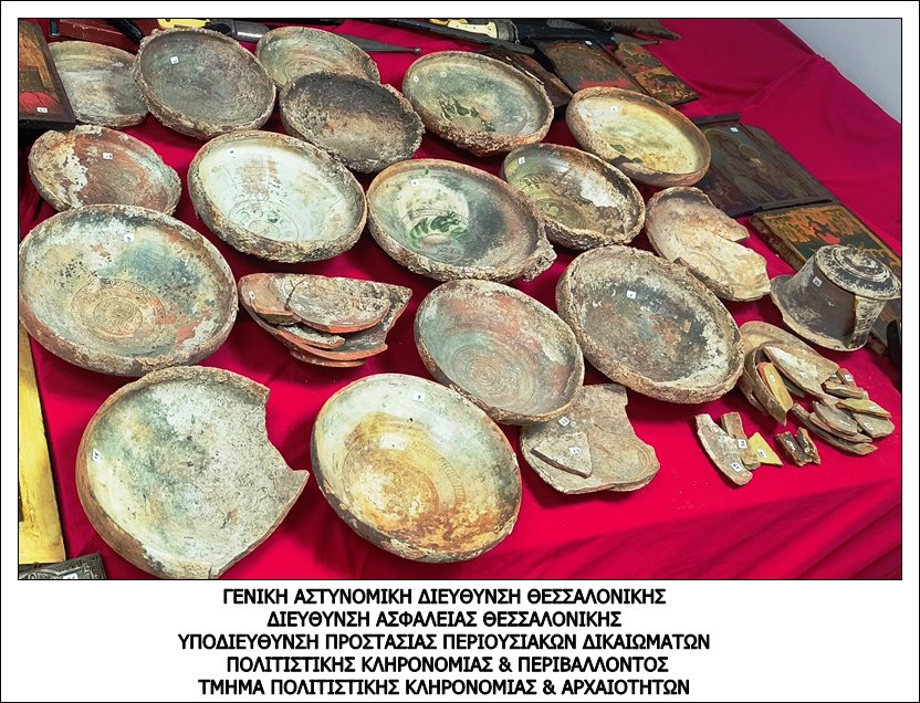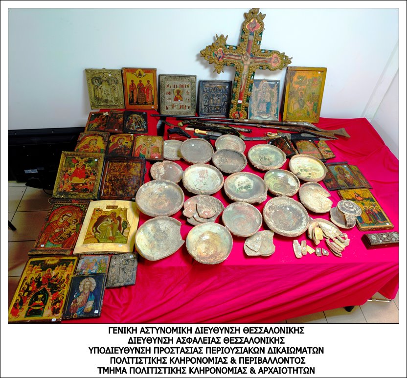 (1) κεραμικό αντικείμενο αρχαίων χρόνων, (52) κεραμικά, εκ των οποίων τα 10 κεραμικά χρονολογούνται στα αρχαία χρόνια (Ελληνιστική περίοδος 4ος αι π.χ.), 42 κεραμικά αντικείμενα που χρονολογούνται πριν το 1453 στη Βυζαντινή περίοδο, τα οποία θεωρούνται ιδιαίτερης αρχαιολογικής και οικονομικής αξίας, (24) θρησκευτικές εικόνες, (1) σταυρός τέμπλου μεταβυζαντινών χρόνων και (2) μεταλλικοί σταυροί, τα οποία σύμφωνα με γνωμάτευση αρμόδιας αρχαιολόγου της Εφορείας Αρχαιοτήτων Θεσσαλονίκης εμπίπτουν στις προστατευτικές διατάξεις του Νόμου που αφορά σε «Κύρωση κώδικα νομοθεσίας για την προστασία των αρχαιοτήτων και εν γένει της πολιτιστικής κληρονομιάς»,