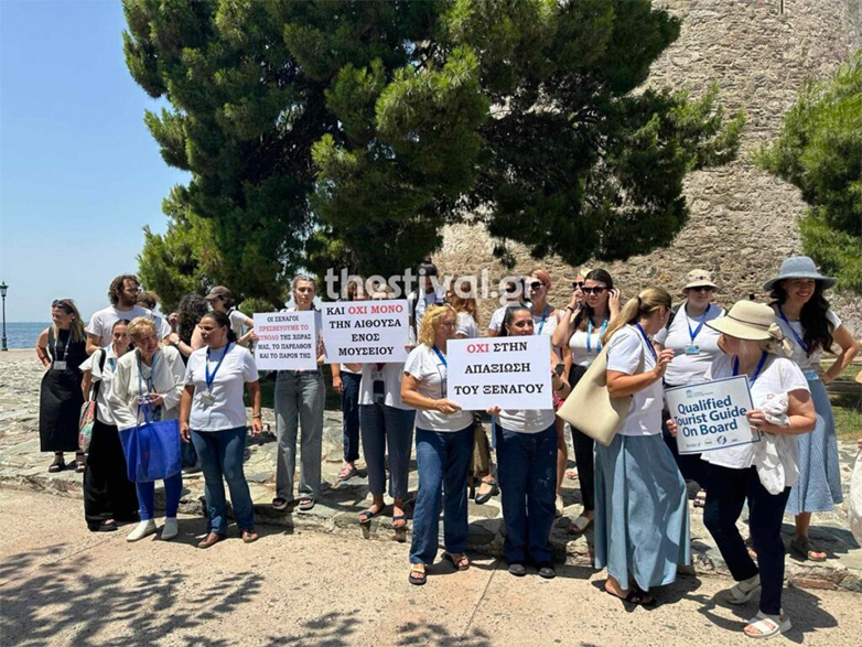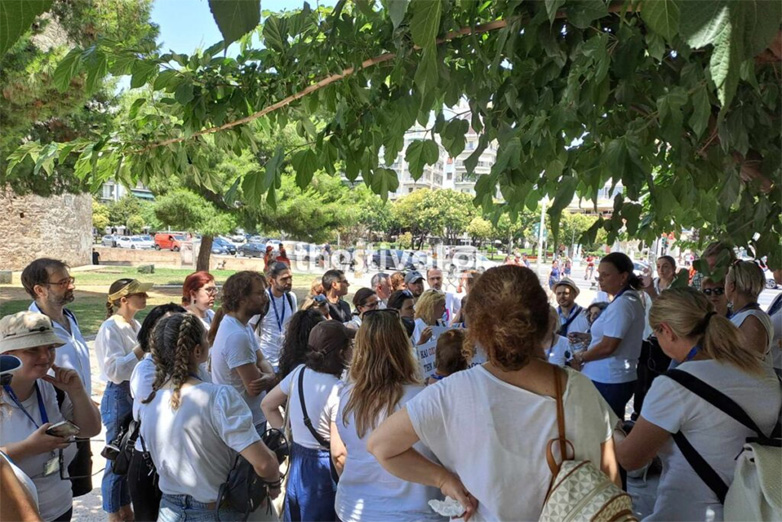 Διαμαρτυρία μπροστά από τον Λευκό Πύργο, στο κέντρο της Θεσσαλονίκης, πραγματοποίησαν το μεσημέρι της Πέμπτης ξεναγοί της πόλης.