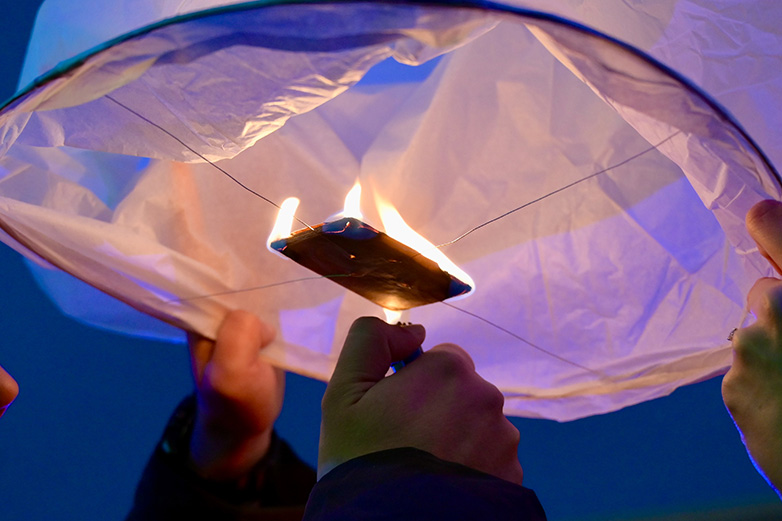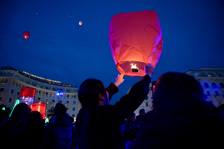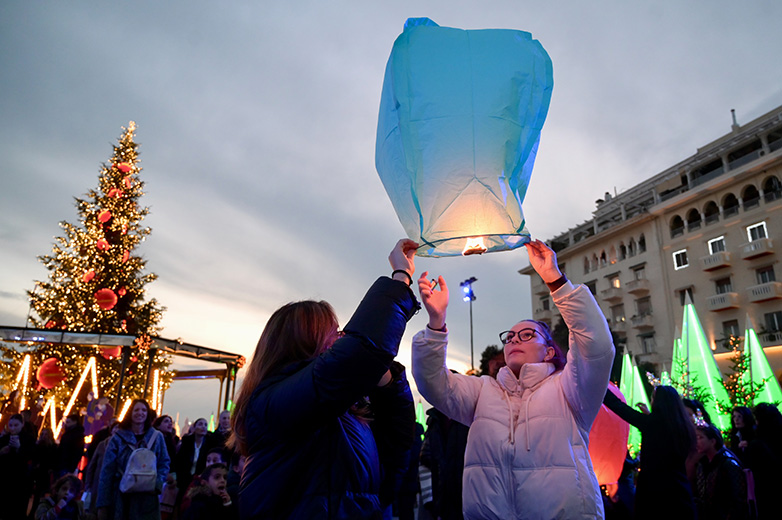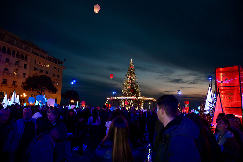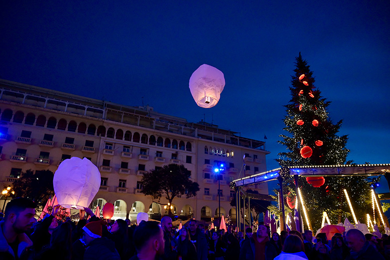 Εκατοντάδες φαναράκια υψώθηκαν μετά τις έξι το απόγευμα στον ουρανό της Θεσσαλονίκης, πάνω από τη στολισμένη πλατεία Αριστοτέλους.