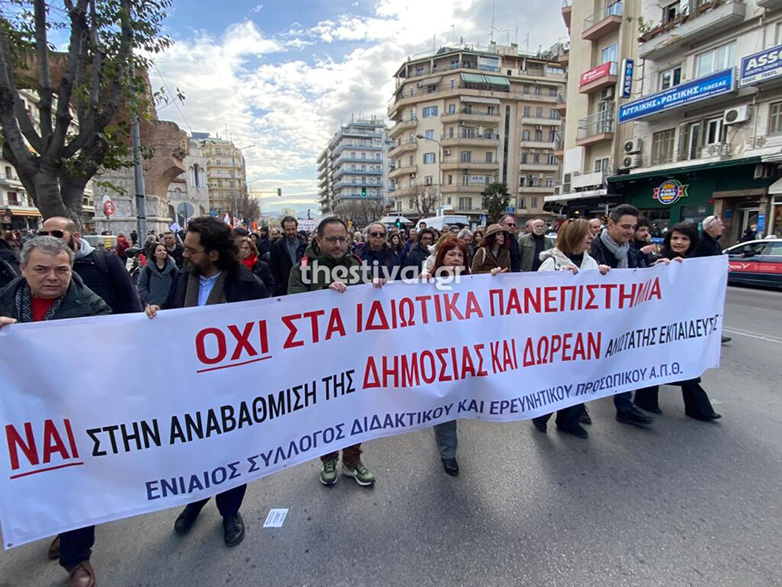 Πορεία στο κέντρο της Θεσσαλονίκης πραγματοποίησαν σήμερα, Πέμπτη 25 Ιανουαρίου, φοιτητές, στο πλαίσιο των κινητοποιήσεών τους ενάντια στο σχέδιο νόμου που θα προβλέπει τη λειτουργία Μη Κερδοσκοπικών – Μη Κρατικών Πανεπιστημίων.