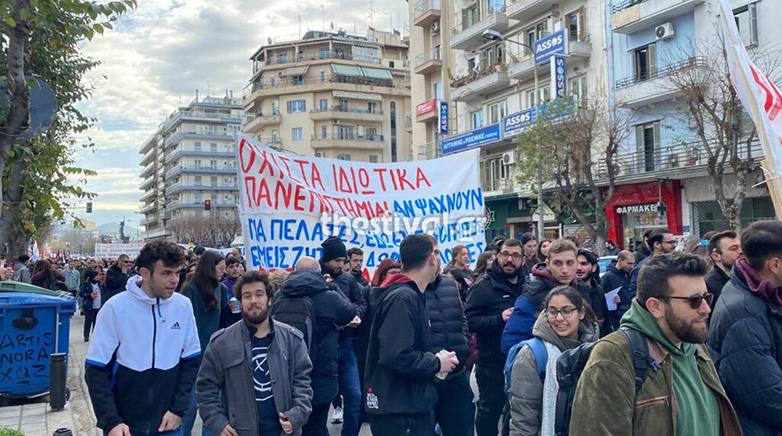 Τα μέλη φοιτητικών παρατάξεων και συλλογικοτήτων του αντιεξουσιαστικού χώρου, καθώς και εκπρόσωποι ενώσεων εκπαιδευτικών συγκεντρώθηκαν στην Πλατεία Καμάρας και από εκεί ξεκίνησαν πορεία μέσω της Εγνατίας Οδού.