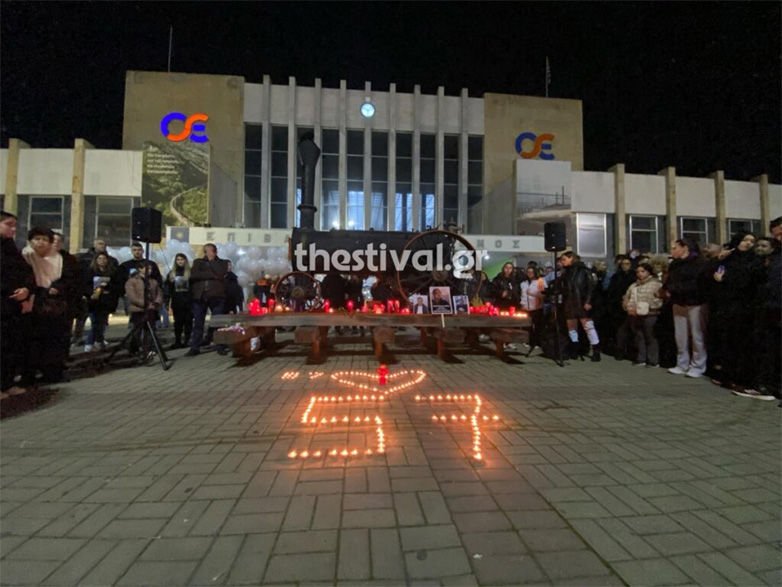 Κεράκια σχημάτισαν μια καρδιά αλλά και τον αριθμό 57, όσοι και οι νεκροί από τη σύγκρουση των δύο τρένων στις 28 Φεβρουαρίου 2023. Παράλληλα στο σημείο άφησαν φωτογραφίες θυμάτων της σύγκρουσης αλλά και λουλούδια στη μνήμη τους.