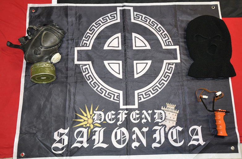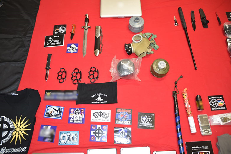 ρουχισμό και τεμάχια υφάσματος με εθνικιστικά και ναζιστικά σύμβολα, πλήθος αυτοκόλλητων, βιβλία και έντυπο υλικό που απεικονίζουν εθνικιστικά σύμβολα, σύμβολα ρατσιστικής φύσεως και λογότυπα της οργάνωσης,