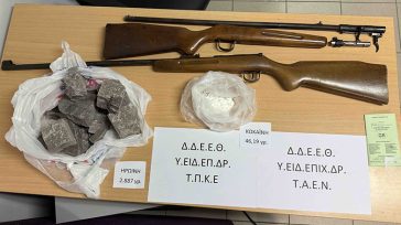 Σε έρευνα που ακολούθησε στην οικία του συλληφθέντα, παρουσία εκπροσώπου δικαστικής Αρχής, βρέθηκαν και κατασχέθηκαν ποσότητα κοκαΐνης (46,19) γραμμαρίων και δύο κυνηγετικά όπλα, τα οποία κατείχε χωρίς σχετική άδεια.