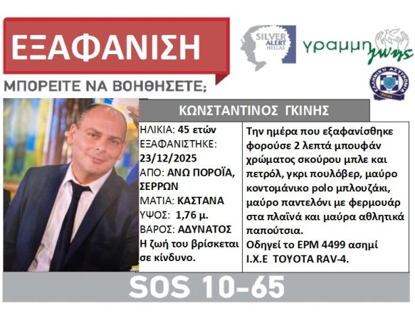 Ο Κωνσταντίνος Γκίνης, 45 ετών, εξαφανίστηκε από το σπίτι του, στην Άνω Πορόϊα Σερρών, το πρωί της 23/12/25, όταν έφυγε από την οικία του προς άγνωστη κατεύθυνση και για άγνωστη αιτία με το υπ’ αριθμόν ΕΡΜ 4499 Ι.Χ.Ε όχημά του, μάρκας TOYOTA RAV-4, χρώματος ασημί. Έκτοτε αγνοείται.