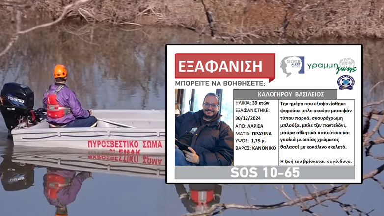 «Ο Βασίλειος Καλογήρου, 39 ετών, εξαφανίστηκε από το σπίτι των γονέων του, που είχε επισκεφθεί για τις γιορτές, στη Λάρισα, το απόγευμα της 30/12/2024, όταν έφυγε για την καθημερινή του βόλτα και δεν επέστρεψε. Έκτοτε, δεν έχει δώσει σημεία ζωής. Έχει καστανά μαλλιά με φαλάκρα κορυφής, πράσινα μάτια, ύψος 1,79μ και είναι κανονικού βάρους. Την ημέρα που εξαφανίστηκε φορούσε μπλε σκούρο μπουφάν τύπου παρκά, σκουρόχρωμη μπλούζα, μπλε τζιν παντελόνι, μαύρα αθλητικά παπούτσια και γυαλιά μυωπίας χρώματος θαλασσί με κοκάλινο σκελετό. Η ΓΡΑΜΜΗ ΖΩΗΣ, ειδοποιήθηκε από τους οικείους του το βράδυ της 01/01/2025 και μετά τη συγκέντρωση των απαιτούμενων δικαιολογητικών, ενεργοποιεί τον Κοινωνικό Συναγερμό SILVER ALERT, για την κινητοποίηση όλων για την ανεύρεσή του. Η ζωή του βρίσκεται σε κίνδυνο.»