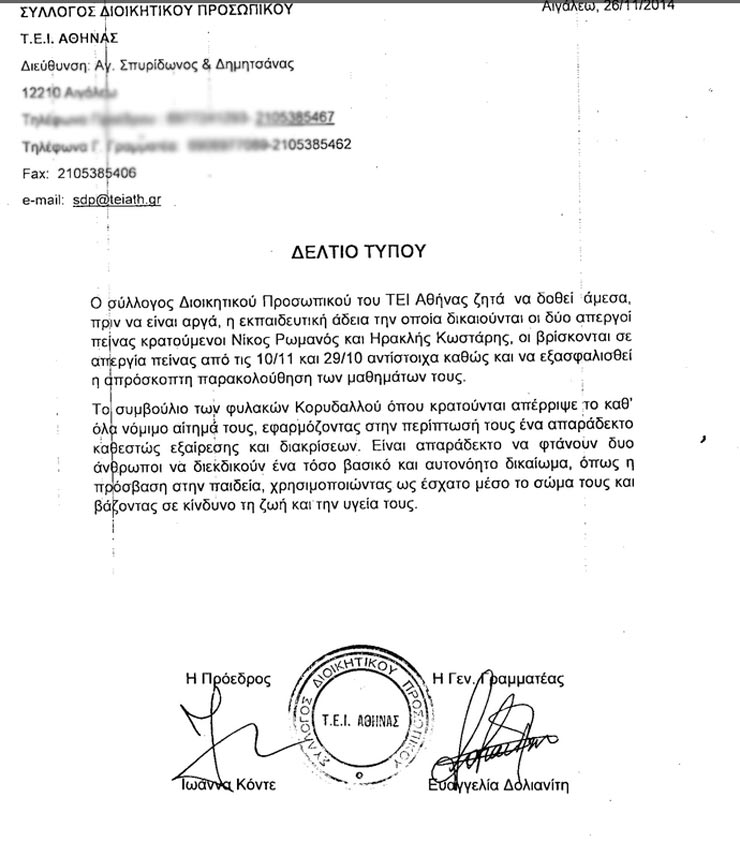 Aνακοίνωση εξέδωσε ο Σύλλογος Διοικητικού Προσωπικού του ΤΕΙ Αθήνας μέσω της οποίας ζητεί να δοθεί άμεσα η εκπαιδευτική άδεια την οποία δικαιούνται οι δύο απεργοί πείνας Νίκος Ρωμανός και Ηρακλής Κωστάρης, καθώς και να εξασφαλιστεί η απρόσκοπτη παρακολούθηση των μαθημάτων τους.