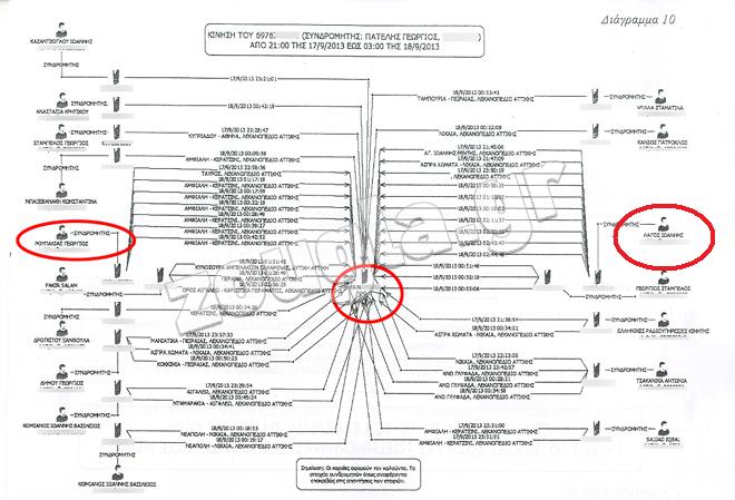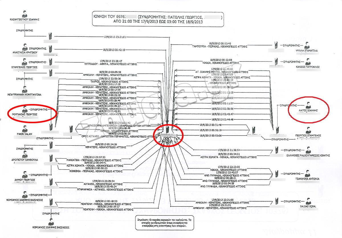 (Στους κόκκινους κύκλους επισημαίνονται τα ονόματα του Γιώργου Ρουπακιά, του Γιώργου Πατέλη και του Γιάννη Λαγού. Από το διάγραμμα των τηλεφωνικών συνομιλιών διαπιστώνεται ότι ο δολοφόνος του Π. Φύσσα κάλεσε τον πυρηνάρχη της Νίκαιας συνολικά επτά φορές, εκ των οποίων η μία λίγη ώρα πριν το φονικό)